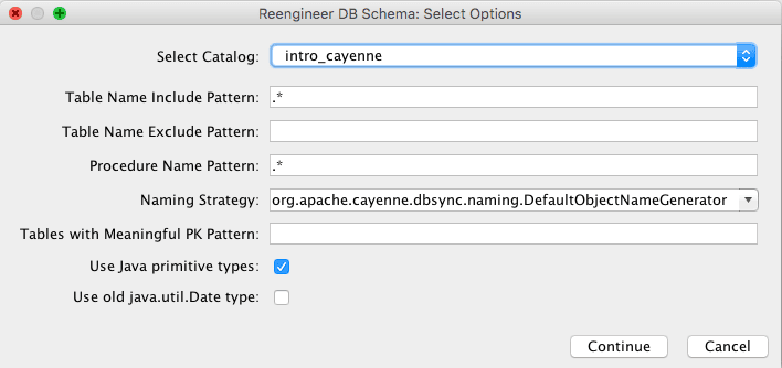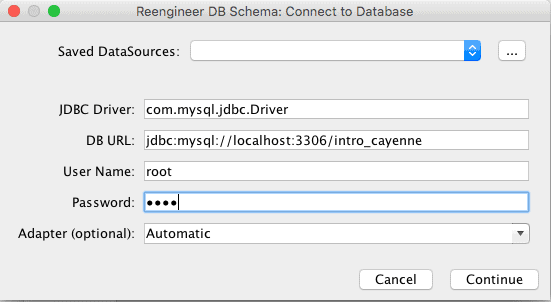 Now let’s go to “Tools > Reengineer Database Schema“, and we’ll have all our mapping configs filled automatically. On the prompt screen just fill the data source configuration available up there in the cayenne-project.xml file and hit continue: