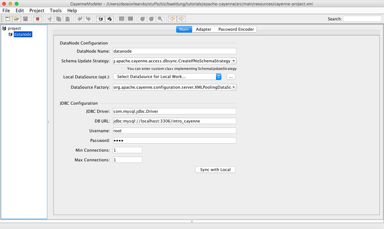 To make Apache Cayenne look up the correct local database, we just need to fill his configuration file with the right driver, URL, and a user in the file cayenne-project.xml located in the resources directory: