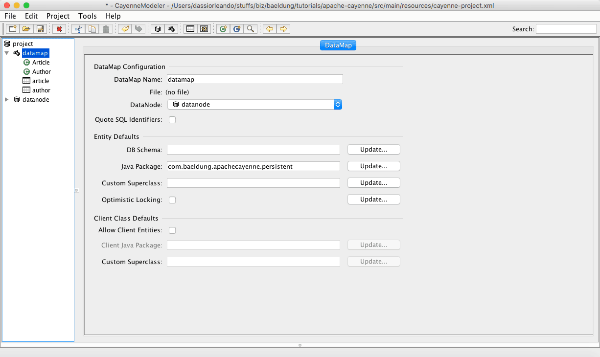 We need also to ensure to put com.baeldung.apachecayenne.persistent as Java package and save it; we’ll see that the XML configuration file has been updated for its defaultPackage property to match the Java package: