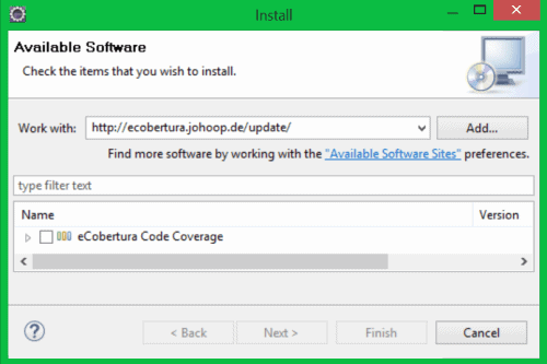 Cobertura is also available as an Eclipse plugin called eCobertura. In order to install eCobertura for Eclipse, you need to follow the steps below and have Eclipse version 3.5 or greater installed: