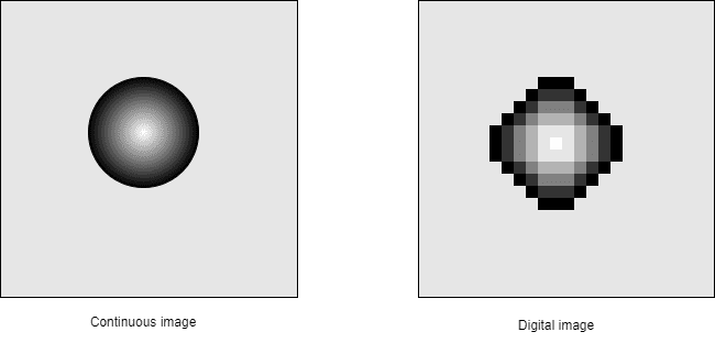 The sensors placed in the image acquisition device capture the projected continuous image. Later, this digitizes to form a digital image suitable for real-time applications. For example, let’s see the difference between a continuous and digital image:
