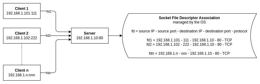 Subsequently, the accept() function creates a new socket, or to be precise, a socket file descriptor. The socket file descriptor is an integer value and unique per client connection. Most importantly, it’s associated with various values in the background by the OS: