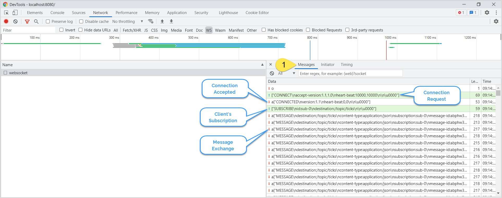 Next, let’s check the message exchange between the client and the server. On the developer tools, click on the Messages tab: