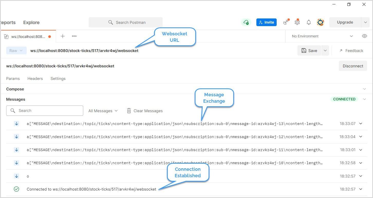 Here, we open a WebSocket using SockJS and then subscribe to the topic /topic/ticks. Eventually, the client consumes and displays the messages on the user interface when the server produces the messages.