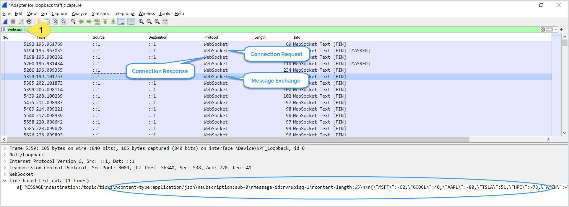 Recall that, after the initial handshake, the client and the server communicate via the websocket protocol. So, let’s filter the packets for websocket. The remaining packets shown reveal the connection and message exchange: