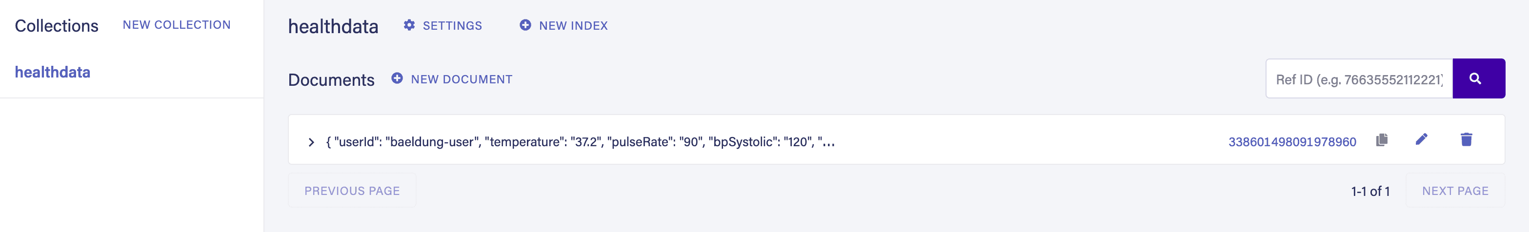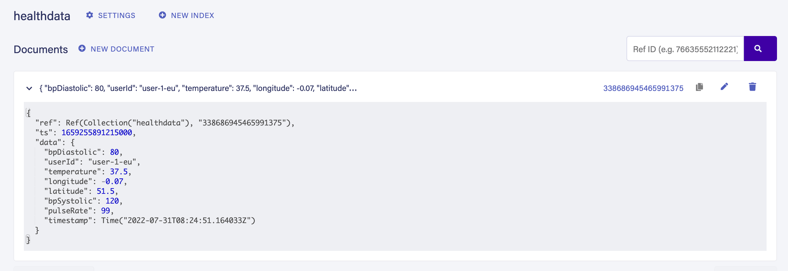 We can also verify the same record in our Fauna dashboard under the HealthData collection for the EU database: