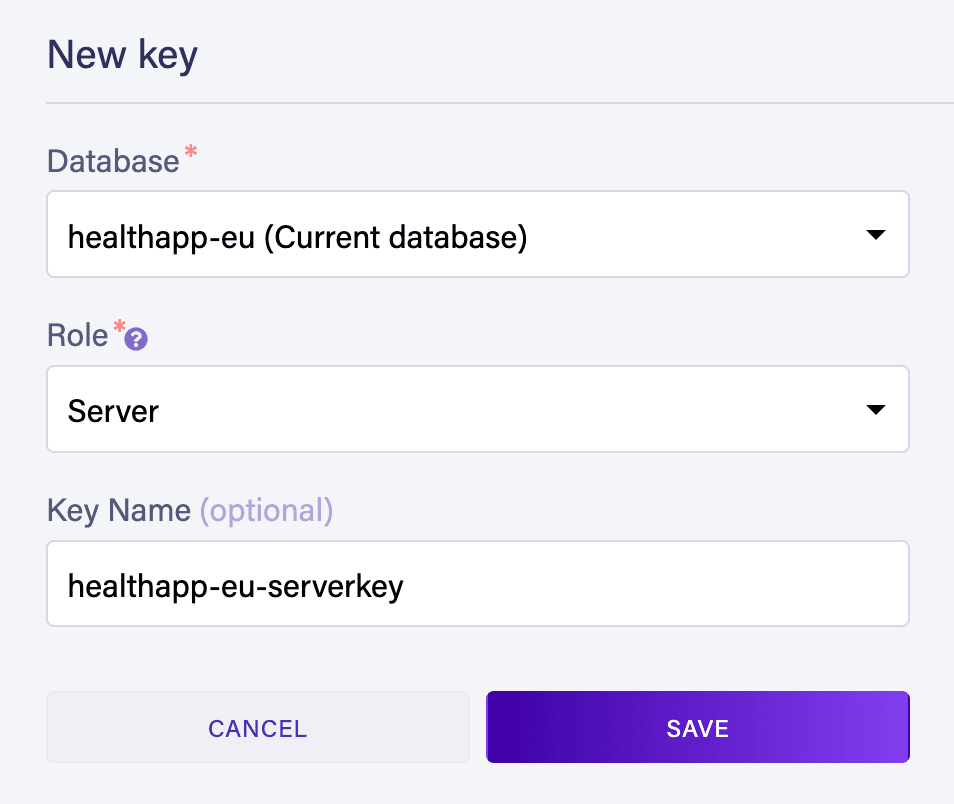 Similarly, we’ll create the key for accessing the healthapp-us database. For more detailed instructions on creating databases and security keys in Fauna, head to our Introduction to FaunaDB with Spring article.