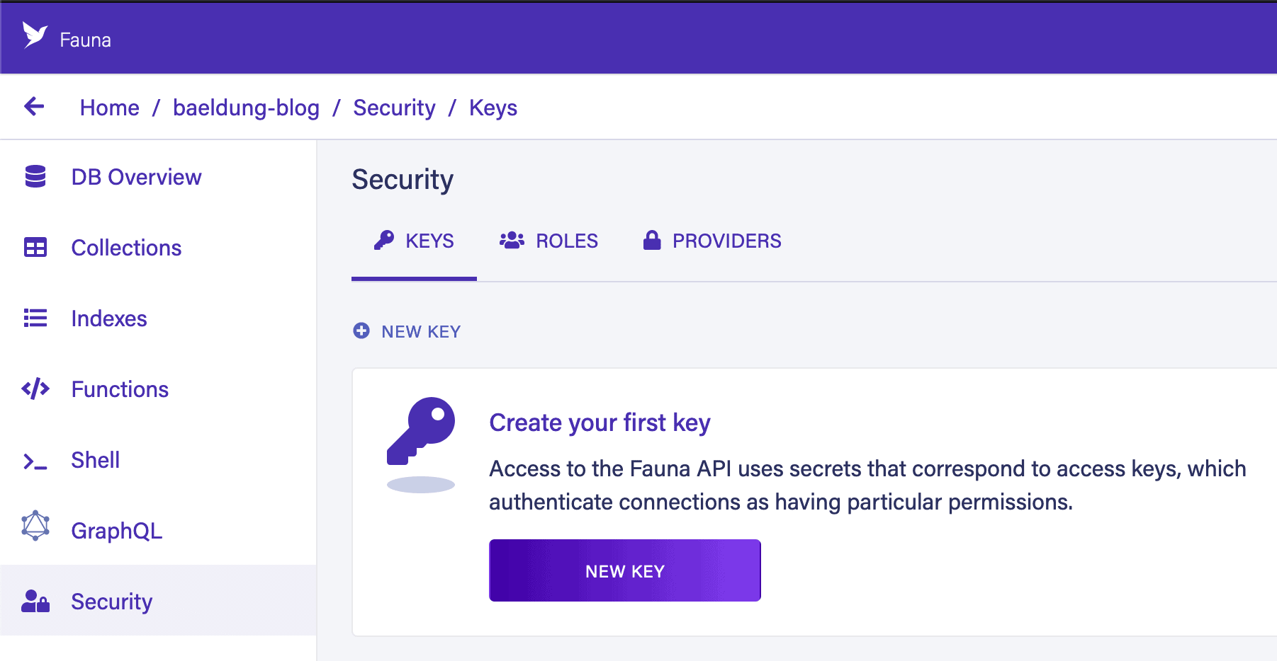 Next, we need to create a security key to access this from our application. We can do this from the Security tab within our database:
