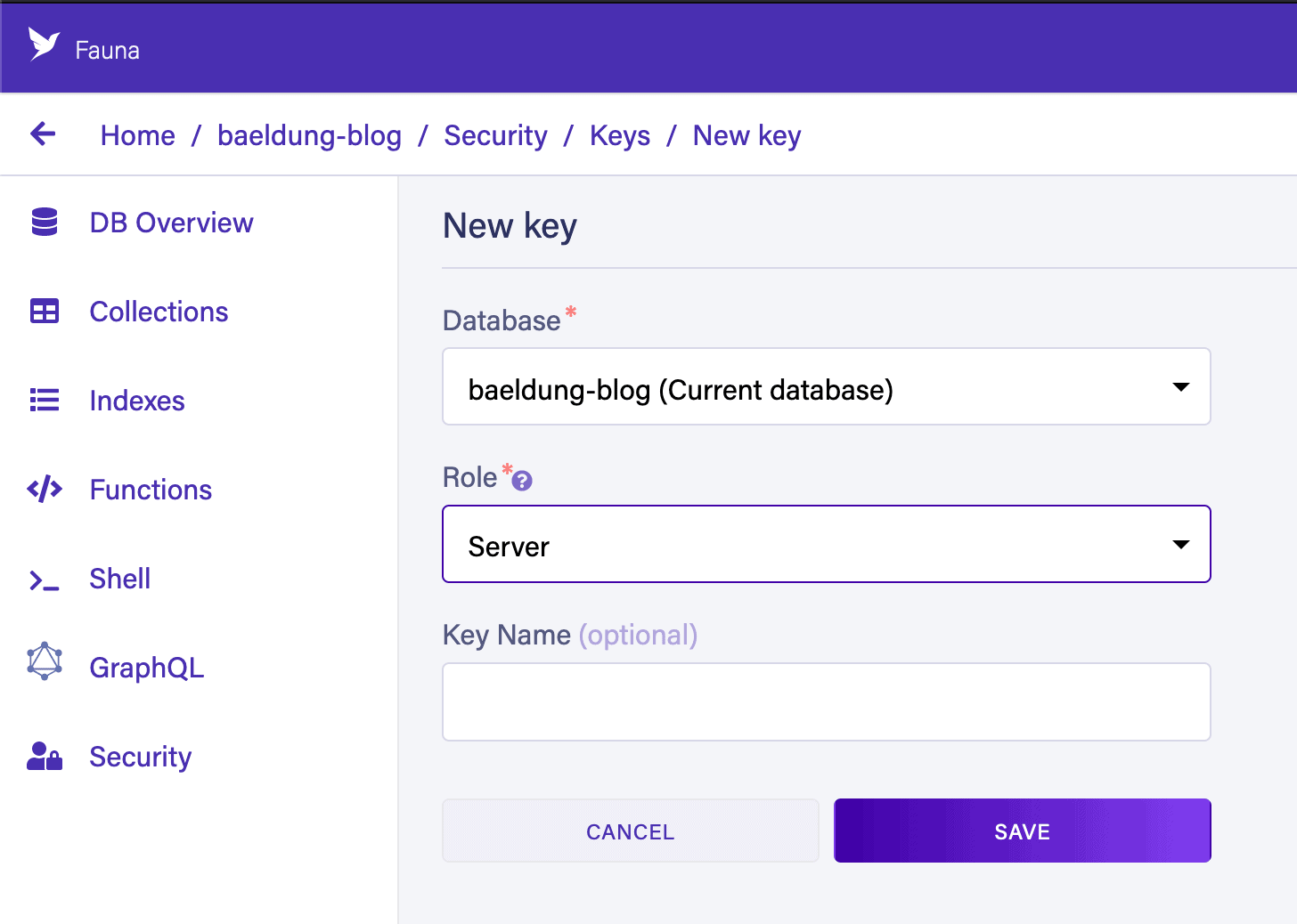 In here, we need to select a “Role” of “Server” and, optionally, give the key a name. This means that the key can access this database, but only this database. Alternatively, we have an option of “Admin”, which can be used to access any database in our account: