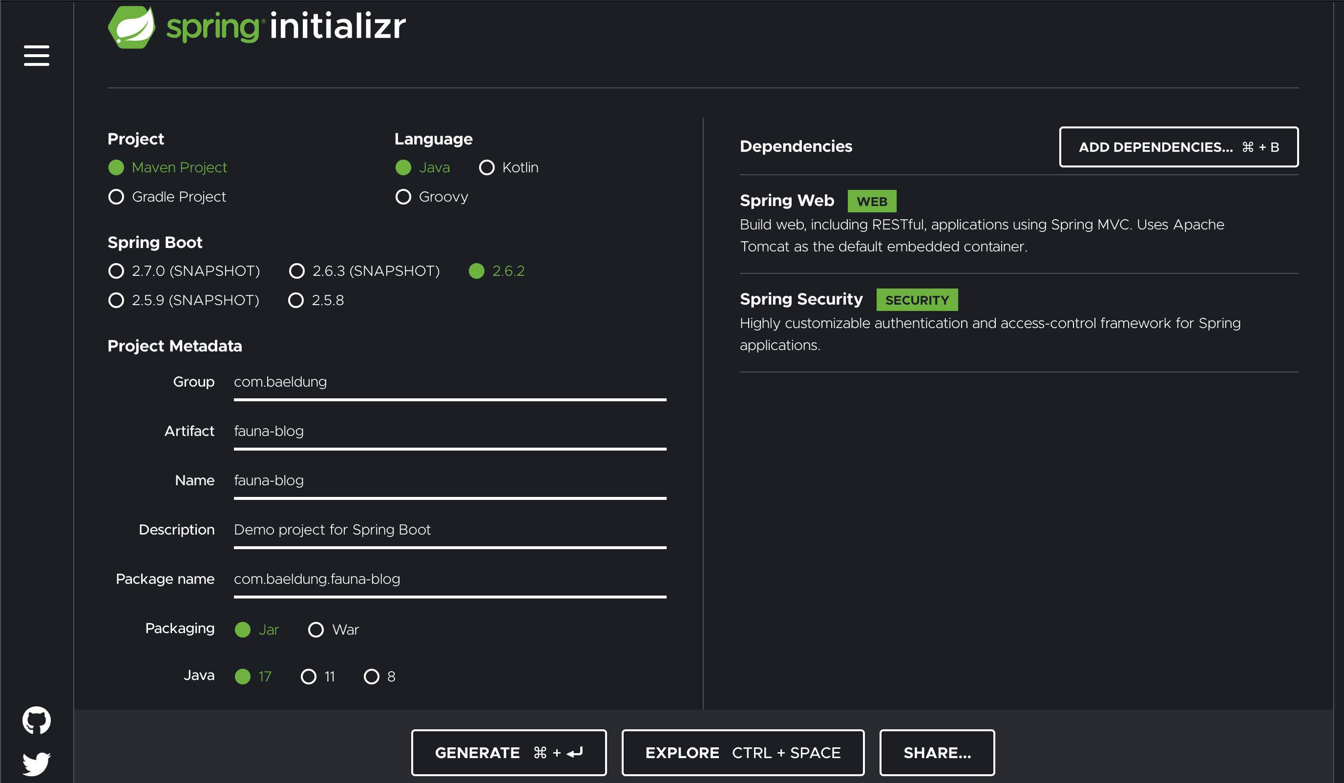 We want to select the options to create a Maven project using the latest release of Spring and the latest LTS release of Java – at the time of writing, these were Spring 2.6.2 and Java 17. We also want to select Spring Web and Spring Security as dependencies for our service: