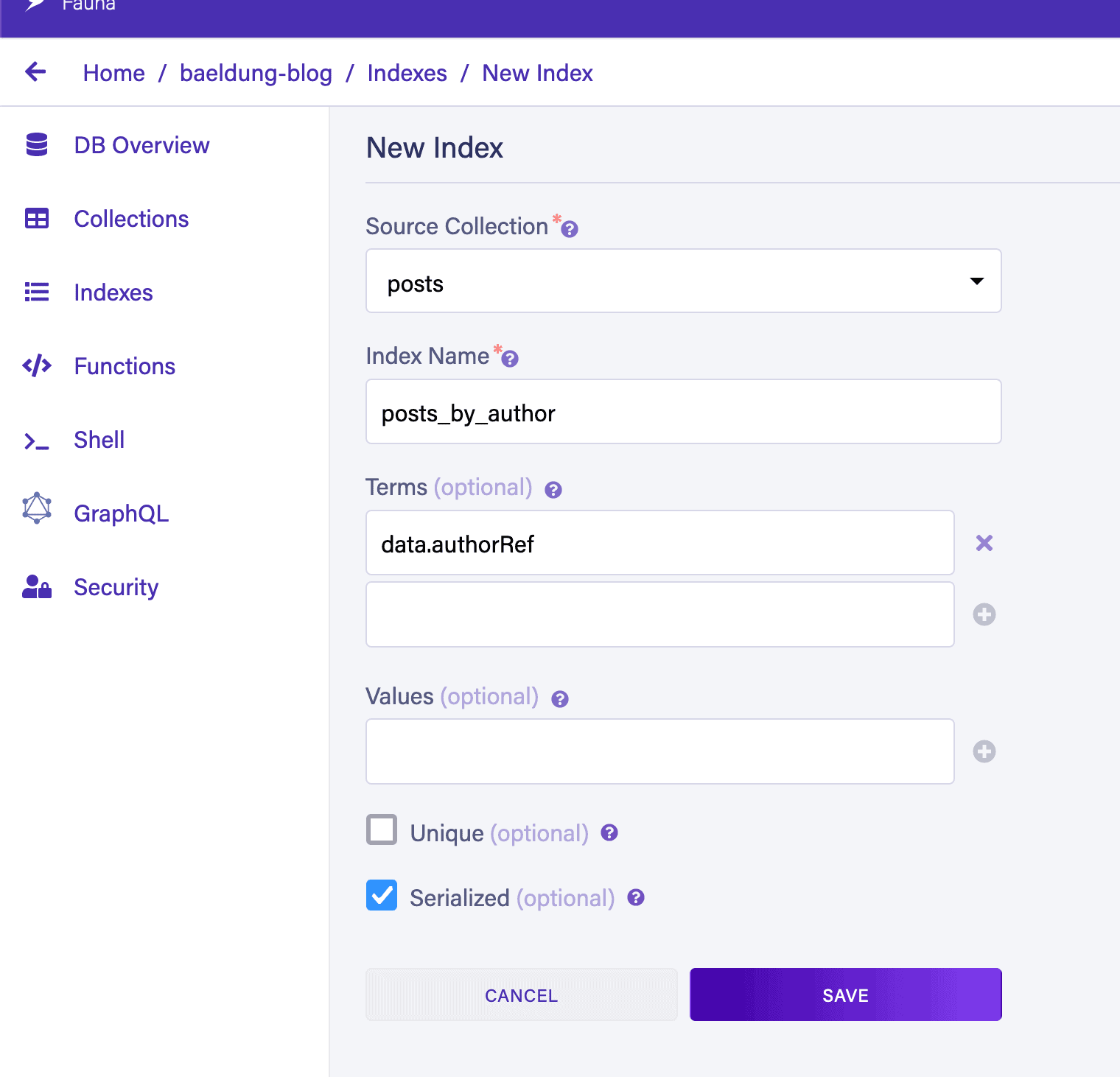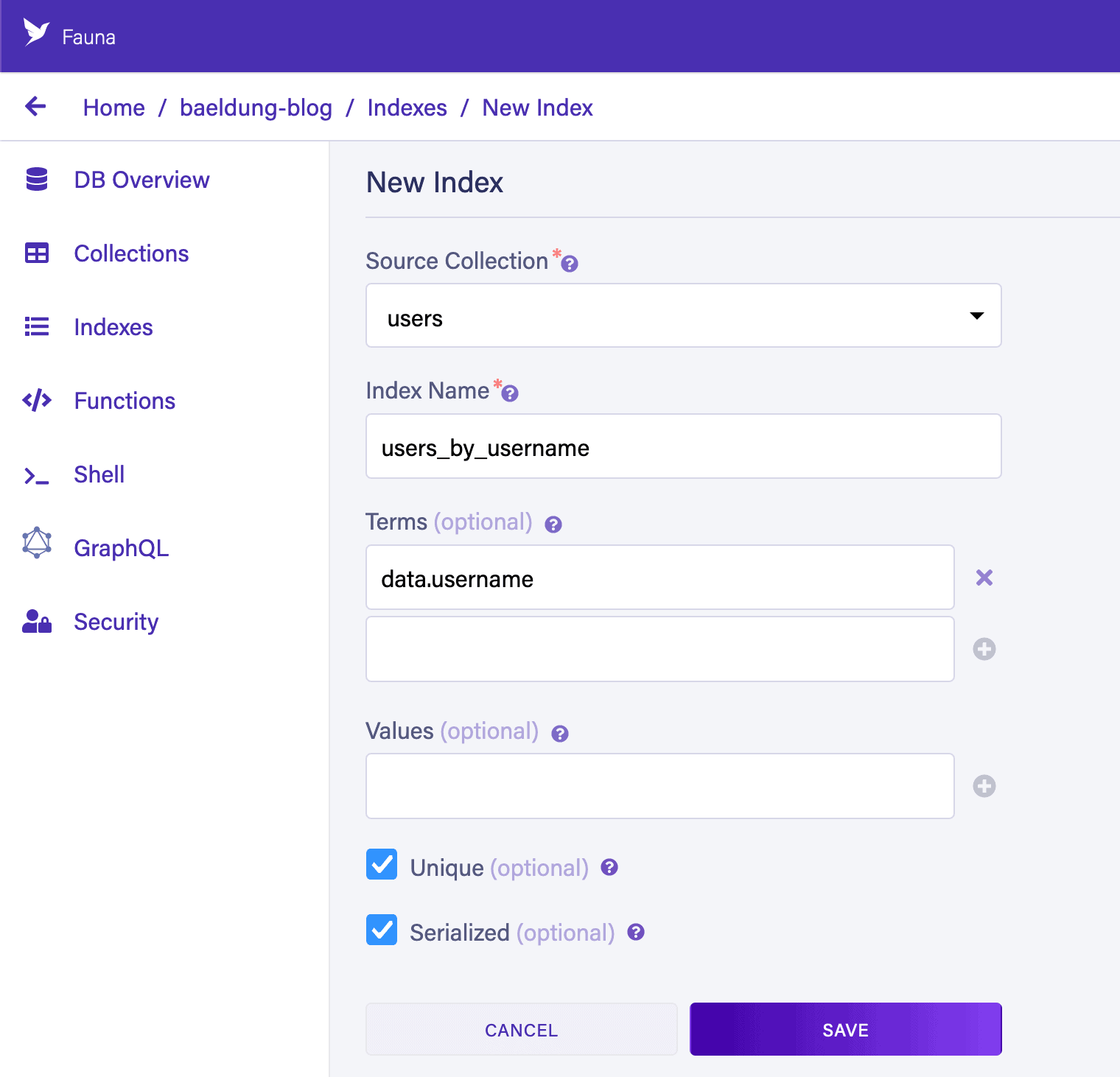 Paginate(Match(Index("users_by_username"), "baeldung")),