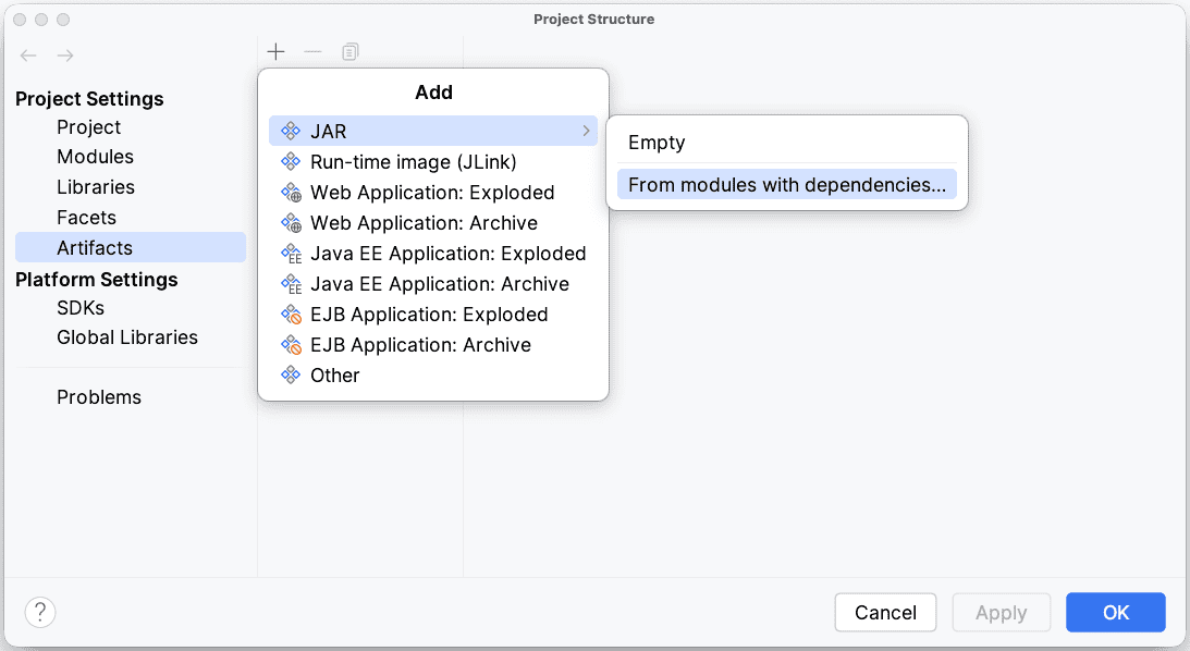 First, in the Project Structure (Ctrl+Alt+Shift+S or Cmd+;), we need to declare a new artifact.