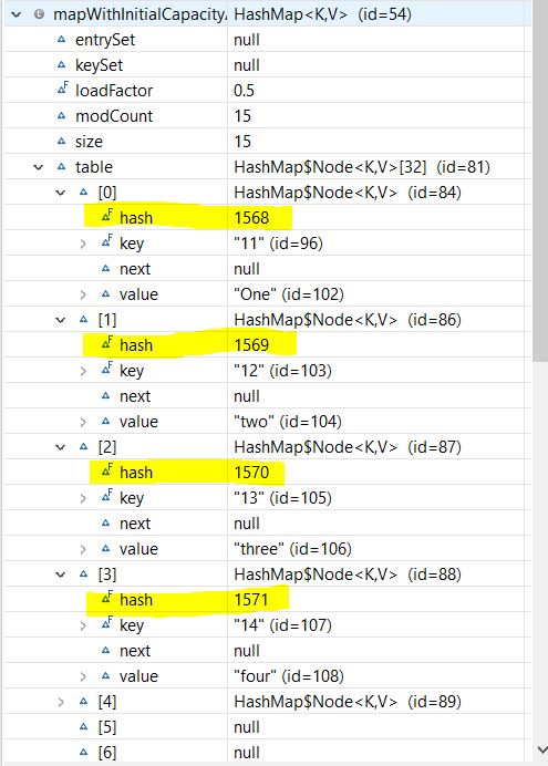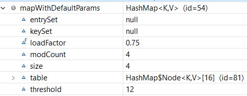 As we see, our HashMap was created with the default initial capacity (16) and the default load factor (0.75). Also, the threshold is 16 * 0.75 = 12, which means that it will increase the capacity from 16 to 32 after the 12th entry (key-value-pair) is added.