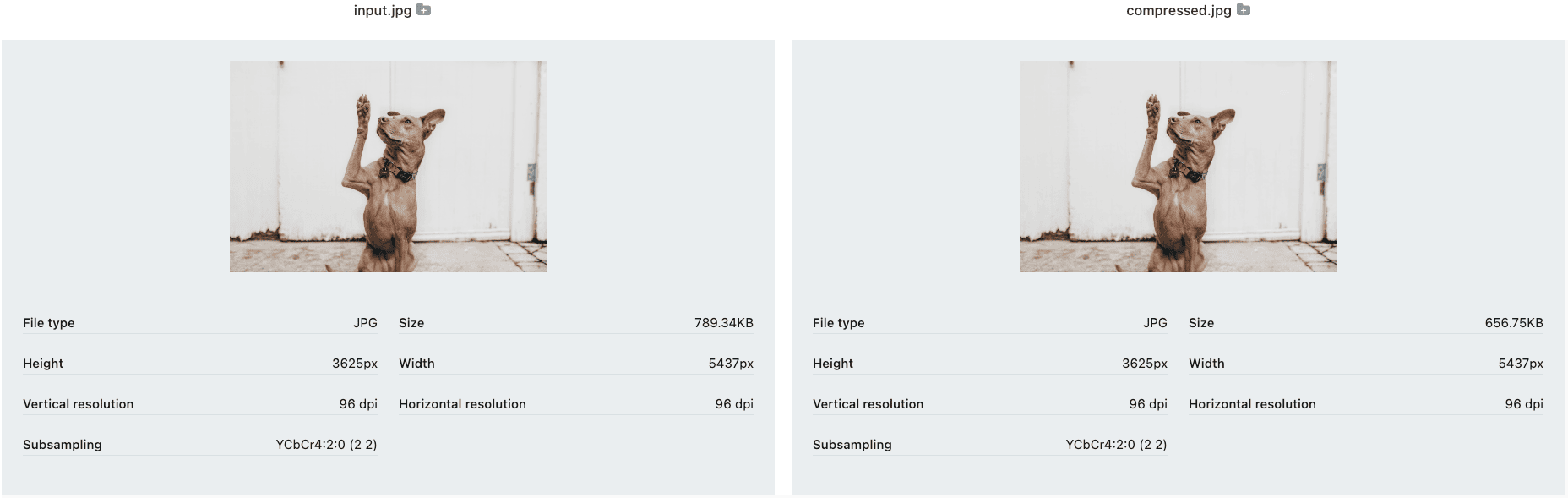 For example, by compressing an example image by 50%, we almost reduced the file size from 790KB to 656KB, a little below 83% of the initial size. Hence, the change in the quality of the picture isn’t noticeable: