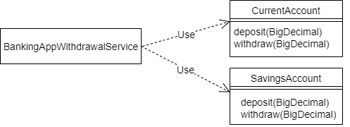 Unfortunately, there is a problem with extending this design. The BankingAppWithdrawalService is aware of the two concrete implementations of account. Therefore, the BankingAppWithdrawalService would need to be changed every time a new account type is introduced.