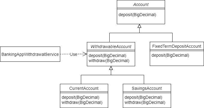 Prior to the refactoring, the Account class had an extra method withdraw that its subclass FixedTermDepositAccount didn’t want. The FixedTermDepositAccount class worked around this by throwing the UnsupportedOperationException for the withdraw method. However, this was just a hack to cover up a weakness in the modeling of the inheritance hierarchy.