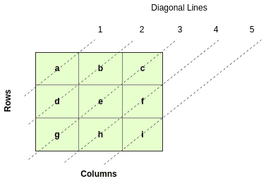 Next, we need to understand how many diagonal lines we have in our array, as seen in the diagram. We do this by first getting the length of one dimension of the array and then using that to get the number of diagonal lines (diagonalLines).