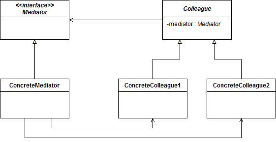 - ConcreteColleague1 and ConcreteColleague2 communicate only through the Mediator