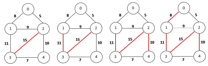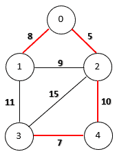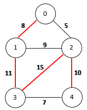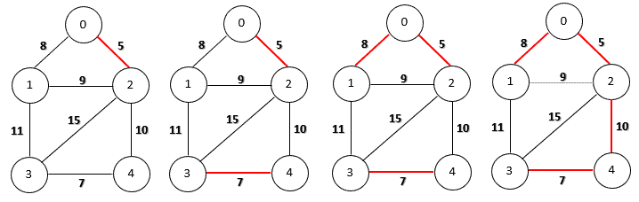 Firstly, we choose the edge (0, 2) because it has the smallest weight. Then, we can add edges (3, 4) and (0, 1) as they do not create any cycles. Now the next candidate is edge (1, 2) with weight 9. However, if we include this edge, we’ll produce a cycle (0, 1, 2). Therefore, we discard this edge and continue to choose the next smallest one. Finally, the algorithm finishes by adding the edge (2, 4) of weight 10.