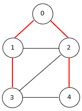 A spanning tree of an undirected graph is a connected subgraph that covers all the graph nodes with the minimum possible number of edges. In general, a graph may have more than one spanning tree. The following figure shows a graph with a spanning tree (edges of the spanning tree are in red):