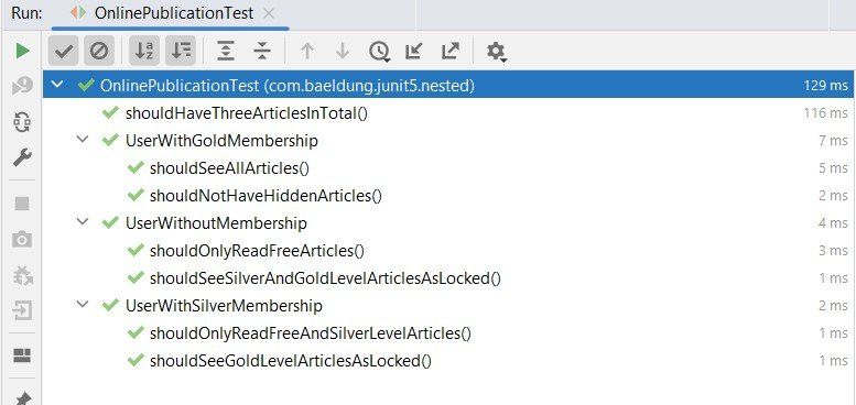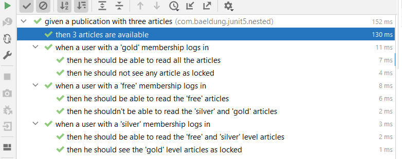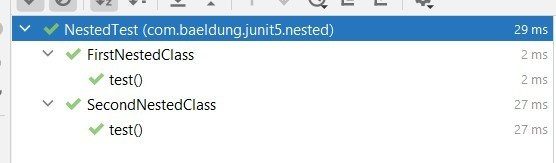 As a result, we can run the parent test class and all the tests from the nested test classes should be executed. Most of the IDEs will show a nice hierarchical representation of the tests: