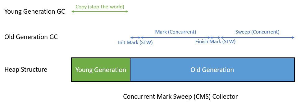 The Concurrent Mark Sweep (CMS) collector introduced in Java 1.4 is a generational, concurrent, low-pause collector. It works with copying in the young generation and mark-sweep in the old generation: