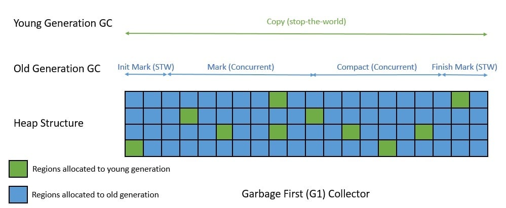 As a long-term replacement for CMS, the Garbage First (G1) collector was introduced in Java 7. G1 is a generational, parallel, concurrent, and incrementally compacting low-pause collector. It works with copying in the young generation and mark-compact in the old generation: