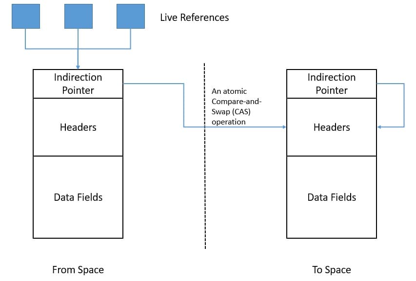 Now, this is where Shenandoah is different from other collectors. A concurrent relocation of objects is tricky as the user program continues to read and write them. Shenandoah manages to achieve this by performing a compare-and-swap operation on the Brooks pointer of an object to point to its to-space version: