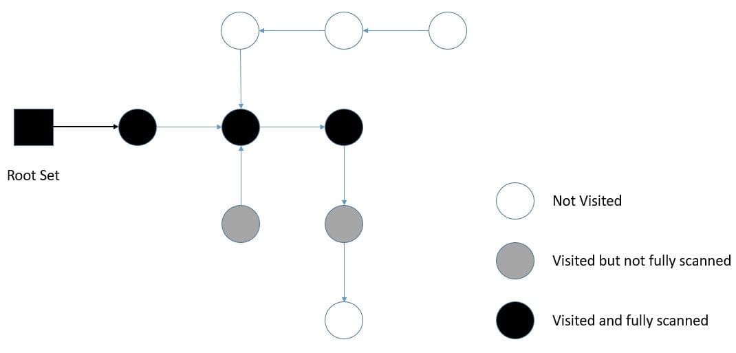 Marking is the process of identifying all objects in the heap or parts of it that are unreachable. We can do this by starting from the root objects and traversing the object graph to find reachable objects. While traversing, we also assign each object one of three colors: white, grey, or black: