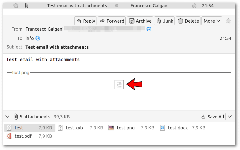 Let’s attach the five files thus created to an email, which we then receive with Thunderbird. The result is that this email client relies exclusively on extensions. In fact, in the center of the email, there is an icon indicating that Thunderbird cannot display the attached image test.png:
