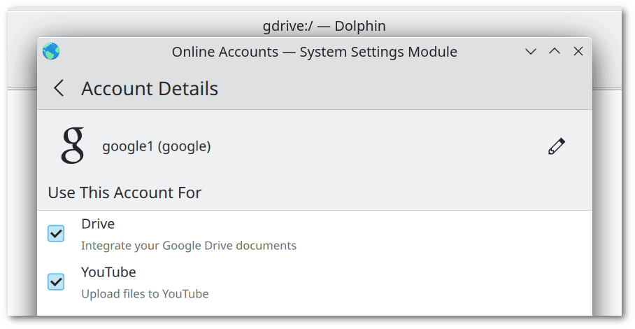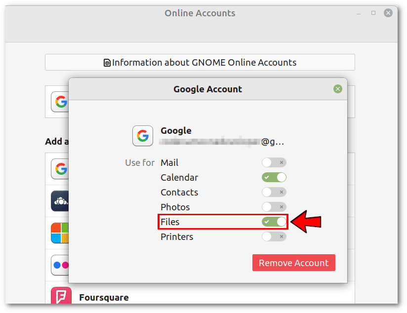 GNOME Online Accounts allows us to choose which Google services we want to integrate into the desktop. We need to make sure we’ve enabled Files, which corresponds to Google Drive: