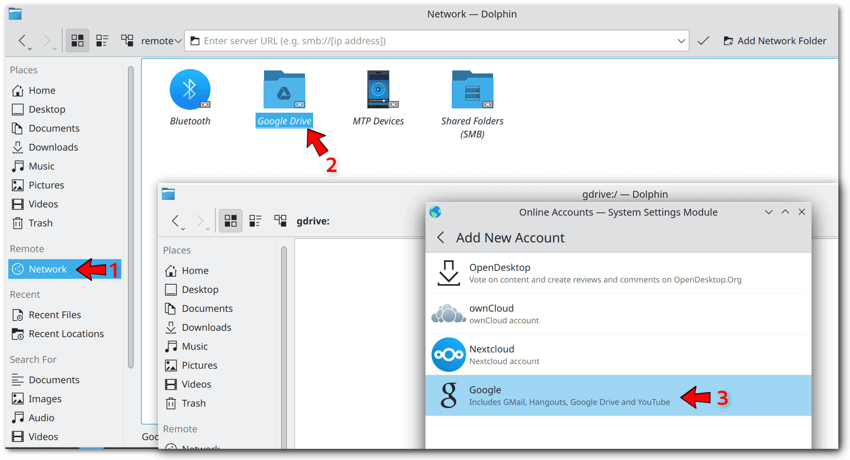 The GNOME and KDE desktop environments come with well-integrated and out-of-the-box Google Drive clients. Configuration is easy and doesn’t require the terminal. On the other hand, these solutions have some usage limitations, as we’ll see.