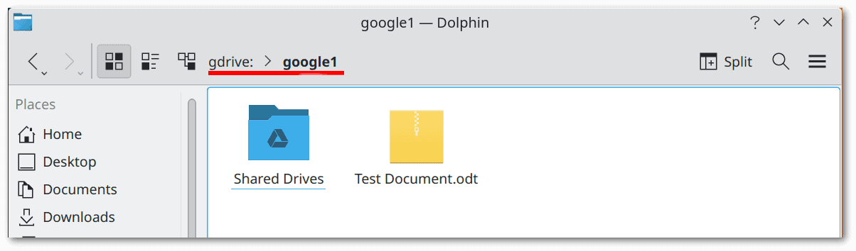 For example, to access our Test Documents.odt file shown in the screenshot above, we need to replace myemail with our email account without @gmail.com, and 1000 with our user id, as returned by id -u: