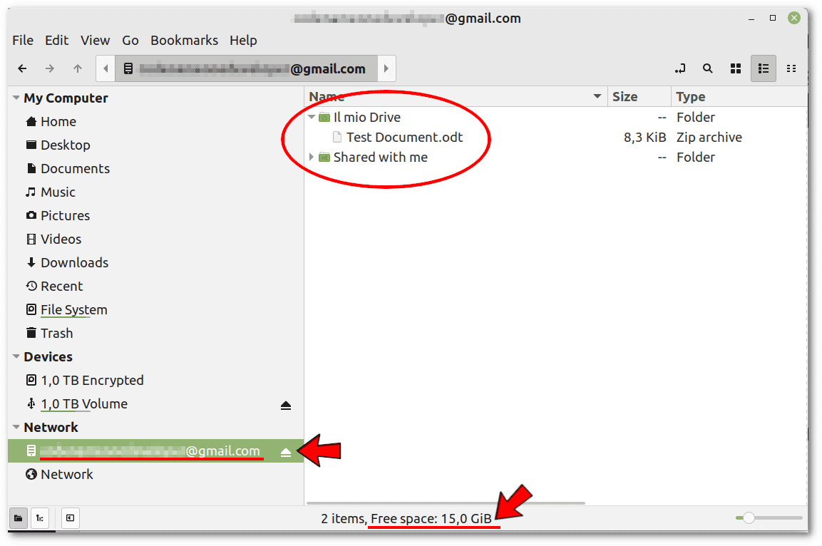 In this way, the integration of Google Drive into the local file system is seamless both with the file manager – Nemo, in our case – and with any other application, such as LibreOffice. This is mainly due to the –vfs-cache-mode full option.
