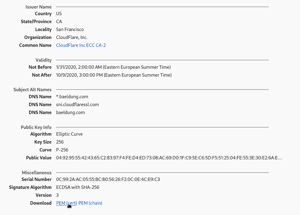 $ openssl s_client -servername baeldung.com -showcerts -connect 172.64.104.34:443