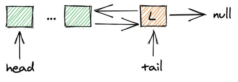 The queue we’ll look at is a doubly-linked FIFO queue where we add new elements after the last element (L) and the variable tail points to that last element: