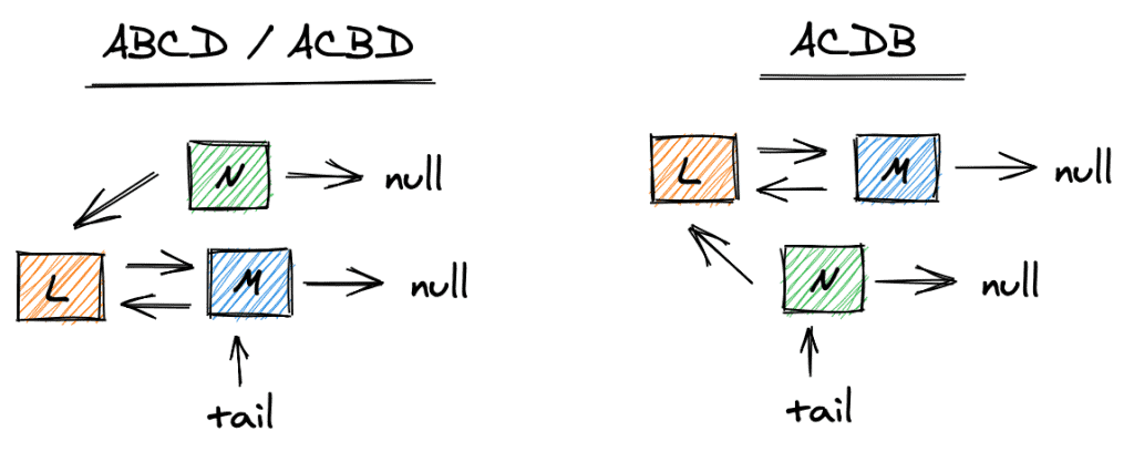 If the steps execute in the order ACDB, tail will point to N, while L will point to M, which will cause an inconsistency in the queue: