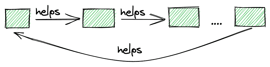 As the helper thread has a helper itself, and, down the whole list of threads, every thread has a helper, we can guarantee that a thread succeeds the insertion latest after every thread has done one insertion. The following figure illustrates the idea: