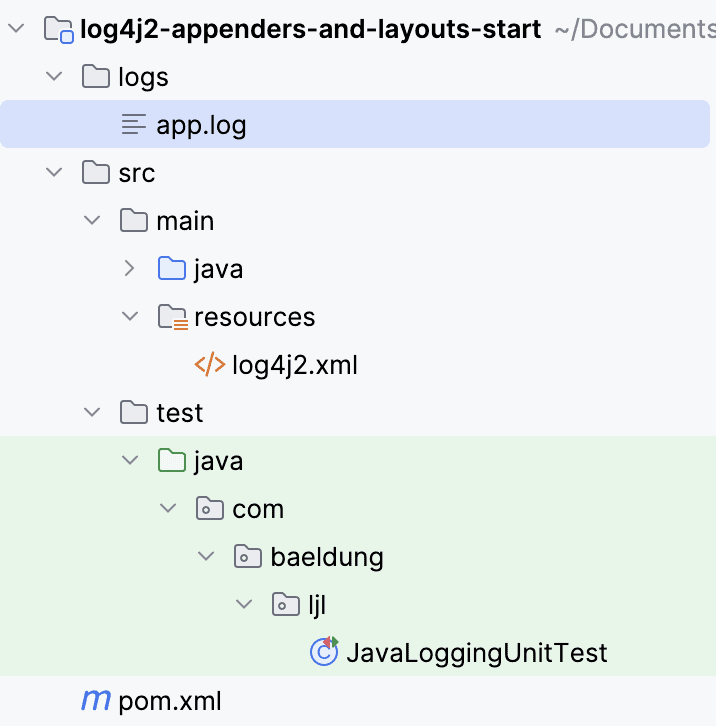 We can see that Log4j 2 creates a new logs directory containing an app.log file in our project’s root (we might need to refresh the IDE’s project explorer to see the new folder).