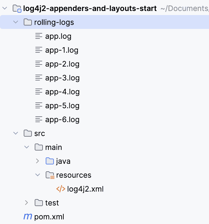 Here, we add a RollingFile appender and configure it to write logs initially to rolling-logs/app.log.