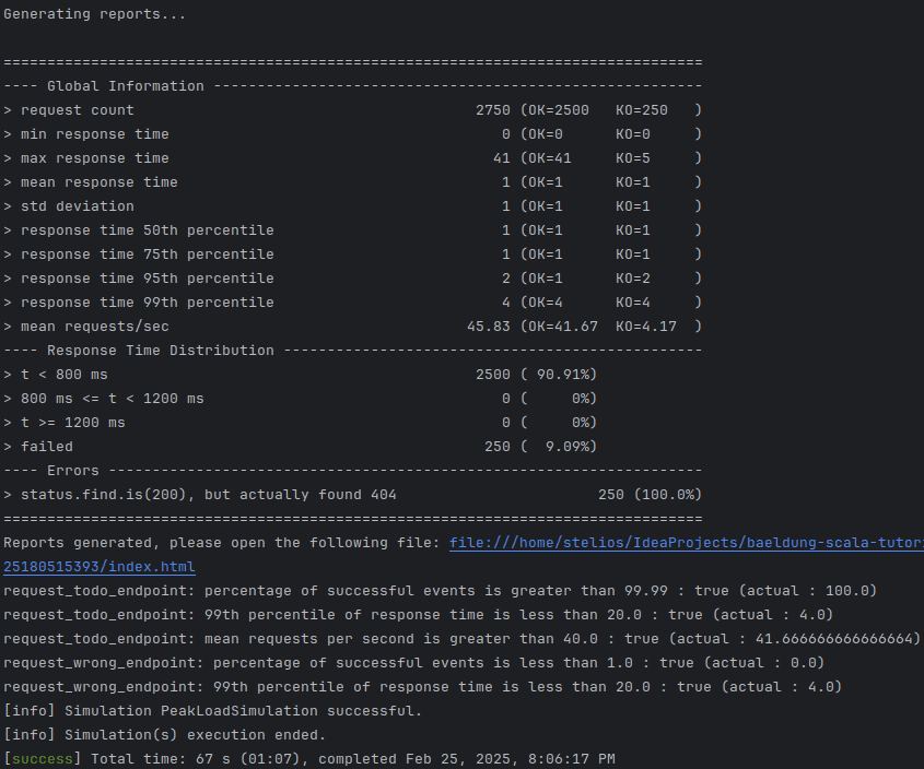 We enrich our simulation by adding four assertions for the two scenarios. Each scenario checks at the end of the execution that the successful rate is the expected one and the response time of 99% of the responses (percentile4) is less than 20 milliseconds, which makes sense when testing servers on localhost. Last, we add the requestsPerSec, to verify that the load we want per scenario is the expected one.