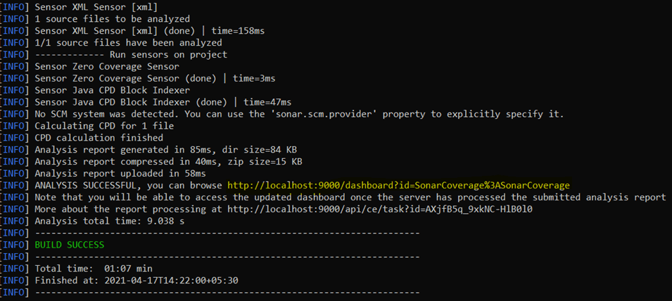 Then we’ll start the SonarQube server before running the command mvn sonar:sonar.