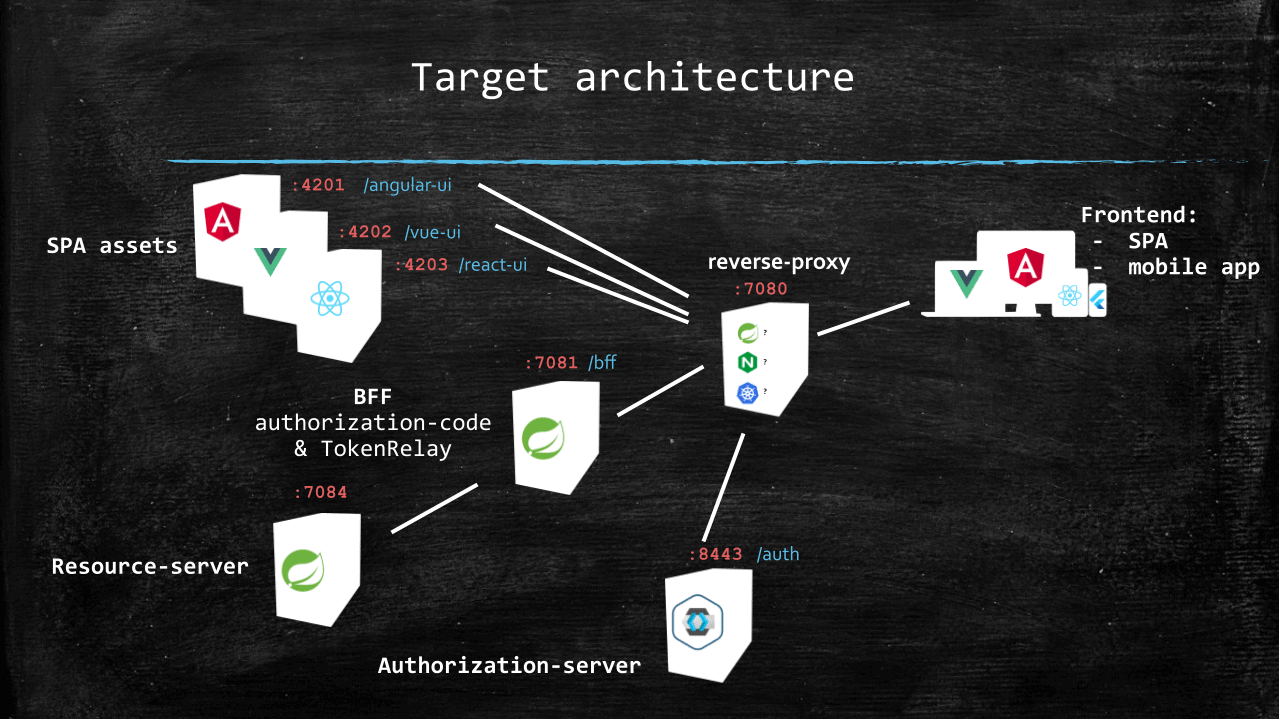 So far, we listed quite a few services: frontends (SPAs), REST API, BFF, and authorization server. Let’s have a look at how these make a coherent system.