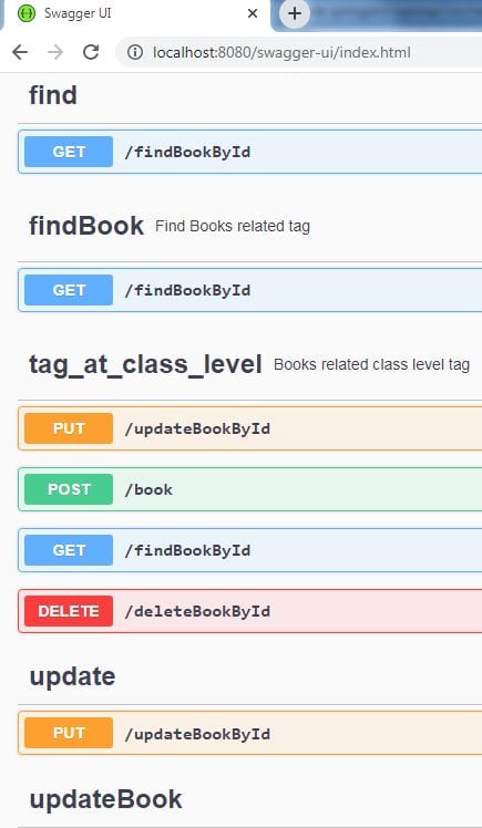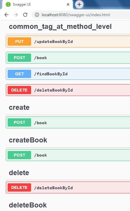 When we run the application, the Swagger UI (http://localhost:8080/swagger-ui.html) displays the tags according to its default display order, with some additional caveats taking precedence:
