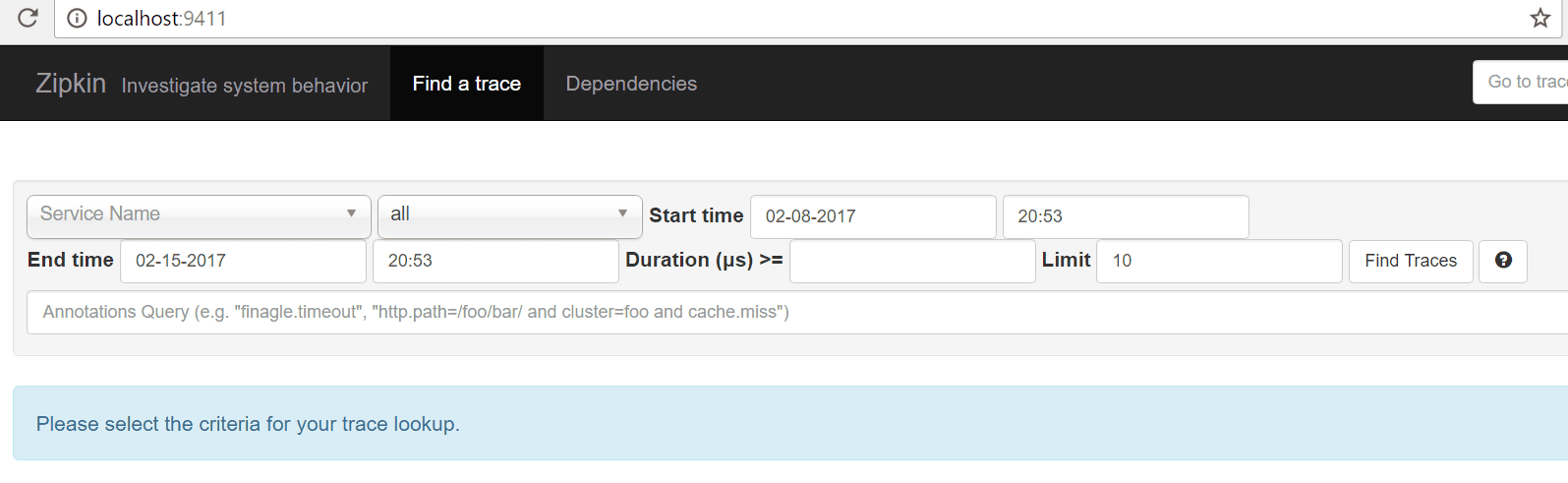 Now let’s run our application and navigate to http://localhost:9411. We should be greeted with Zipkin’s homepage: